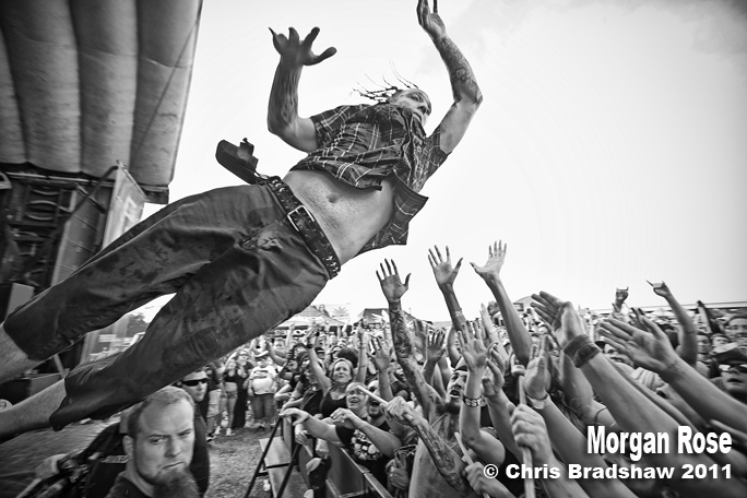 This was shot at the Rock Star Uproar Tour in Tampa. You would think that my buddy Morgan would let me know he was going to jump so I could be ready. At the end of the show the band aways walks to the front of the stage and thanks their fans. Next thing I knew Morgan dove off the stage. Chris grabbed the first fame and I shot the rest of the images. I keep forgetting to ask Morgan if his fans have ever missed catching him?